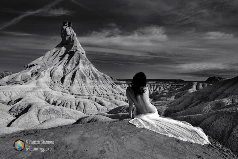 Autoscatto di Patrizia nel paesaggio lunare di Bardenas Reales. Nikon D3000, Tokina 11-16 f2.8, treppiede, 11mm, 1/80s, f13